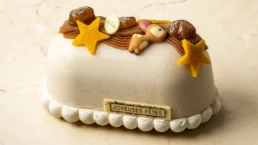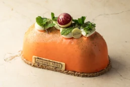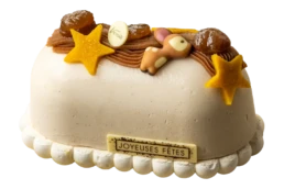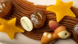 Le parfum d’une forêt enneigée au cœur de la Provence. Meringue croustillante, chantilly vanille, mousse marron et clémentines Corse.